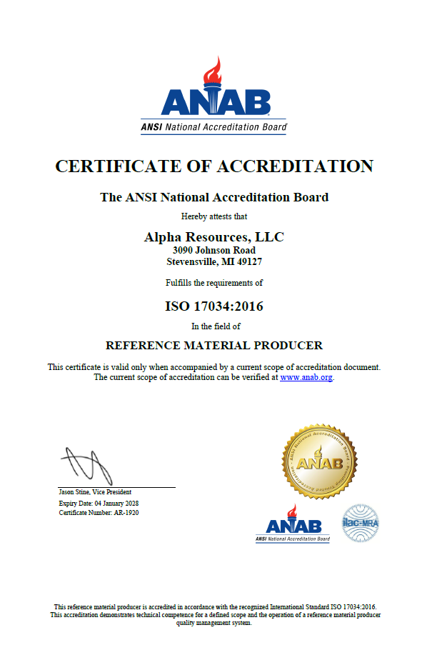 Stevensville, Michigan, January 12th, 2026 – Alpha Resources LLC is pleased to announce the following new product offerings and updates in certified reference materials which have been released in Q4 of 2025 from their ISO 17025 lab. Click to read more